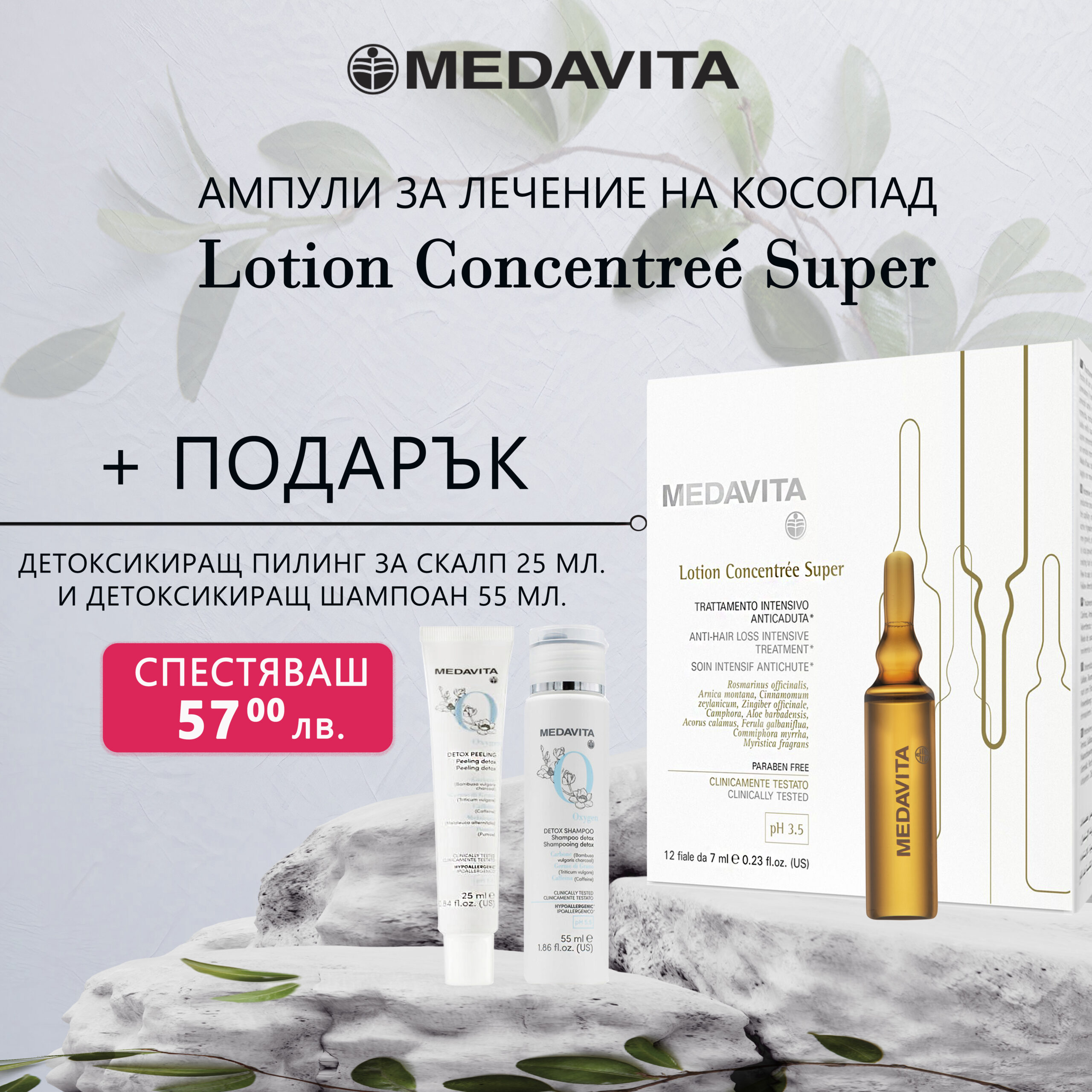 Ампули за косопад от серията Lotion Concentree на Medavita са високоефективна терапия със 100% растителен произход, специално създадена за моментално овладяване на активен, силно изразен косопад. Независимо дали се дължи на хормонален дисбаланс, стрес, боледуване или наследственост, тази формула дава сигурни резултати.